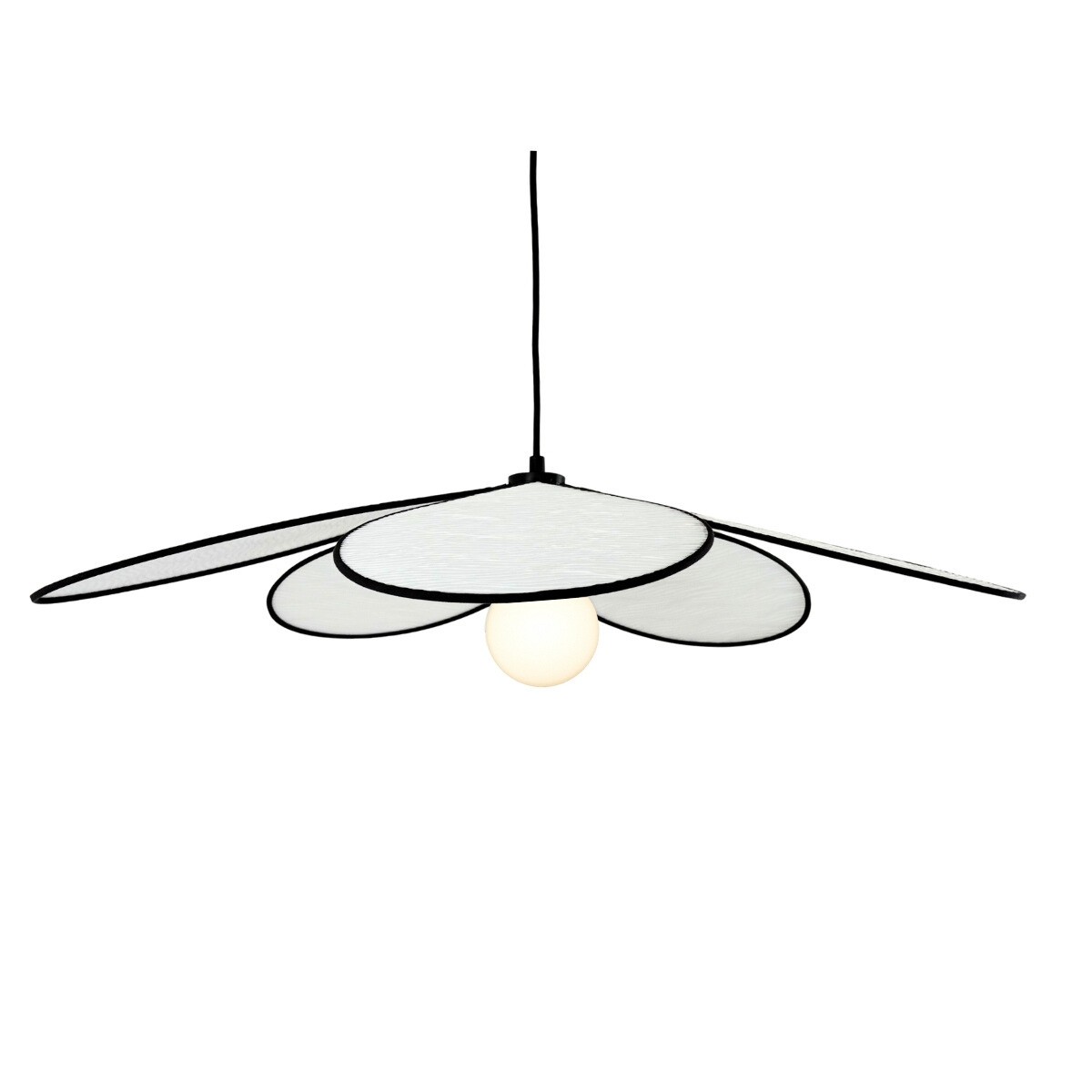 Ses palmes en fils métalliques de 3mm sont habillées d'un papier japonais et gansées de coton noir. Elles diffusent la lumière de façon harmonieuse, créant un jeu d’ombres et de reflets qui transforme instantanément l’atmosphère de votre pièce.